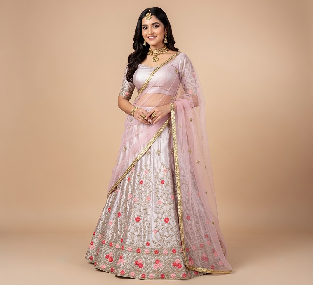 This lehanga set offers a blend of traditional style and modern appeal, designed for comfort and lasting elegance at weddings, parties, or festive occasions. The set includes a semi-stitched skirt with delicate floral embroidery, a matching blouse, and a net dupatta with detailed borders, creating a cohesive and graceful look. The fabric is lightweight and breathable, making it suitable for all-day wear. This lehanga set easily solves your need for a statement-making ethnic outfit that ensures confidence and helps you stand out at any event, while the thoughtful design allows for flexibility and easy adjustments to your size.
