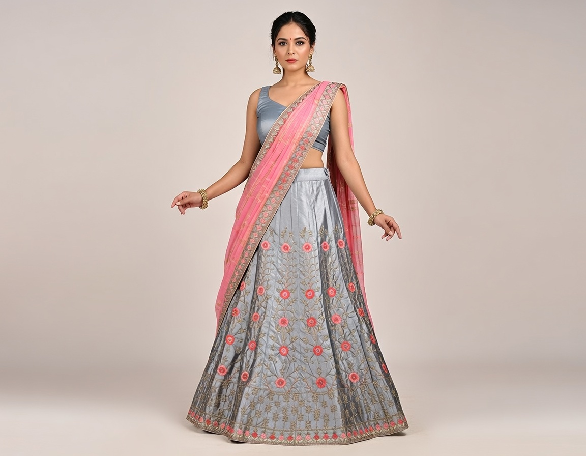 This lehanga set offers a complete solution for anyone seeking a traditional outfit that combines style and ease of wear. The coordinated blouse, skirt, and dupatta provide a ready-to-wear choice for weddings, festivals, or parties. The grey lehanga features refined embroidery with floral detailing, solving the need for a statement ensemble that is both attractive and comfortable. The pink dupatta adds contrast to the design, making the set versatile for various occasions. With its harmonious color palette and quality construction, this lehanga set is ideal for customers looking for convenient, all-in-one ethnic wear that enhances their appearance.