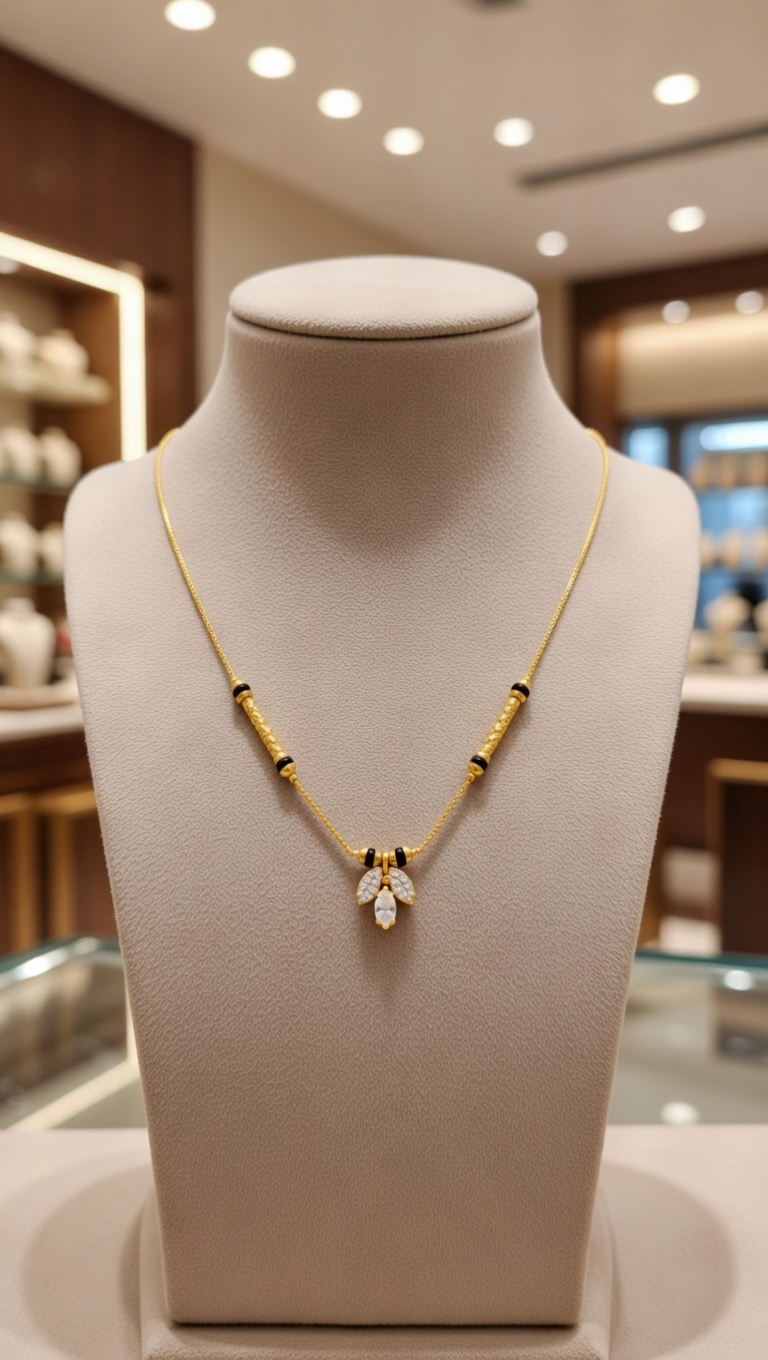 This gold mangalsutra pendant necklace offers a practical and stylish way to complete your traditional look. Designed for everyday comfort, its lightweight build provides ease of wear, while the secure clasp ensures it stays in place all day. The combination of gold and timeless black bead accents allows it to suit both classic and contemporary wardrobes. The pendant features a neat cluster of stones set for added elegance without excess. If you are looking for a versatile mangalsutra that solves the challenge of pairing quality with understated sophistication, this piece works easily for formal and casual settings alike, fulfilling the need for all-day reliability and refined design.