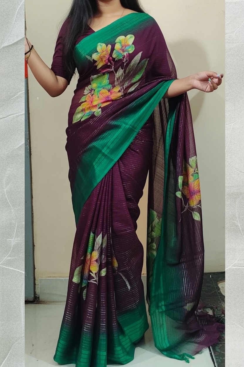 This saree with blouse combines convenience and style in one set. Designed for easy draping and comfort, it features lightweight material ideal for daily wear or special occasions. The modern floral print adds a touch of color and distinction, while the included matching blouse ensures a consistent and put-together look without the need to shop separately. Suitable for various climates and low-maintenance care, this saree with blouse set is a reliable choice for anyone seeking a practical and stylish solution for traditional wear.